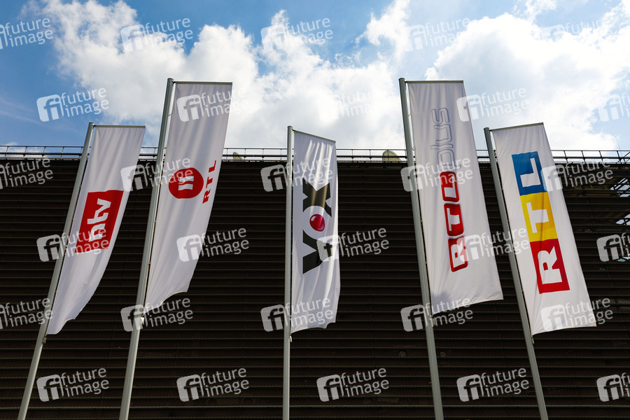 Fahnen mit Sender-Logos der Mediengruppe RTL Deutschland am Picassoplatz. Köln, 26.04.2019