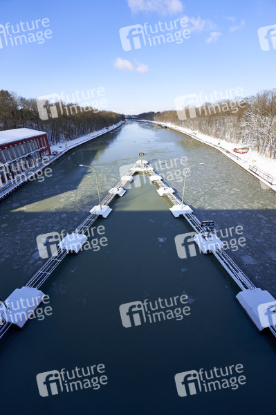 Eingestellter Schiffsverkehr durch winterliche Verhältnisse auf dem Mittellandkanal an der Hindenburgschleuse in Hannover-Anderten. Hannover, 11.02.2021