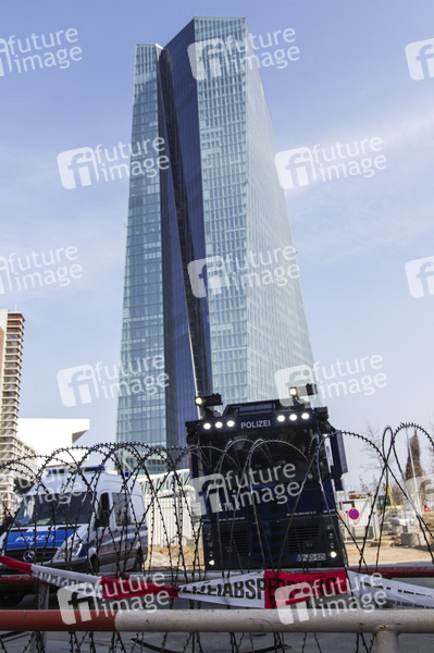 Die kapitalismuskritische Blockupy-Bewegung hat zu einem Protesttag gegen die europäische Krisenpolitik aufgerufen. Anlass ist der Festakt zur Eröffnung der neuen Zentrale der Europäischen Zentralbank (EZB). Es kommt zu Ausschreitungen und Angriffe auf Polizisten. Demonstranten versuchen, das weiträumig abgesperrte Gelände der EZB zu stürmen, werden aber von der Polizei gestoppt. Frankfurt am Main, 18.03.2015