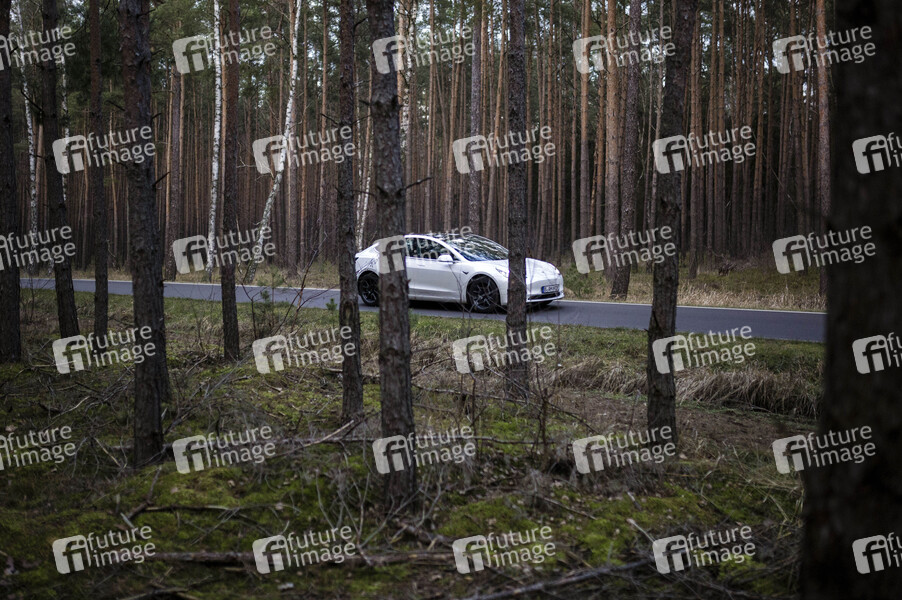 Ein Tesla Model 3 fährt auf einem Waldweg nahe Grünheide. Grünheide, 19.01.2020