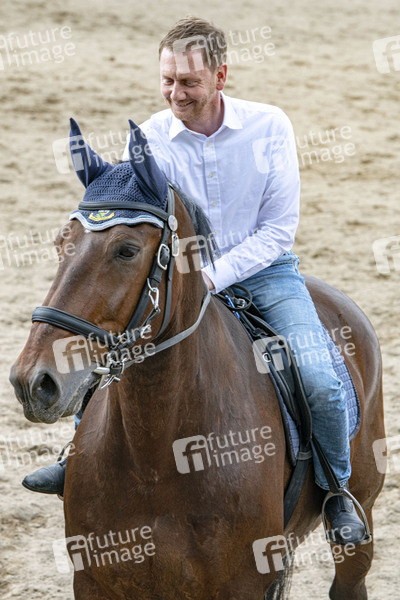Michael Kretschmer auf dem Pferd Rübezahl beim Besuch der Polizeireiterstaffel in Großerkmannsdorf. Radeberg, 23.07.2020