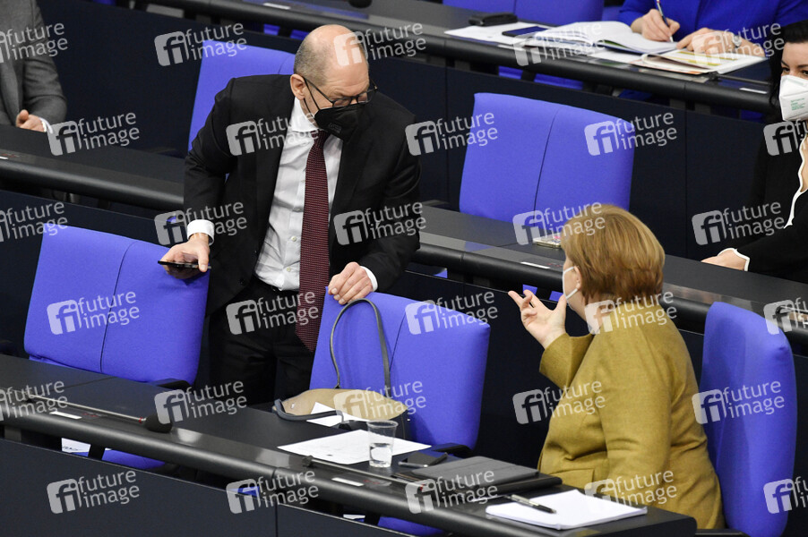 Olaf Scholz und Angela Merkel in der 209. Sitzung des Deutschen Bundestages im Reichstagsgebäude. Berlin, 11.02.2021