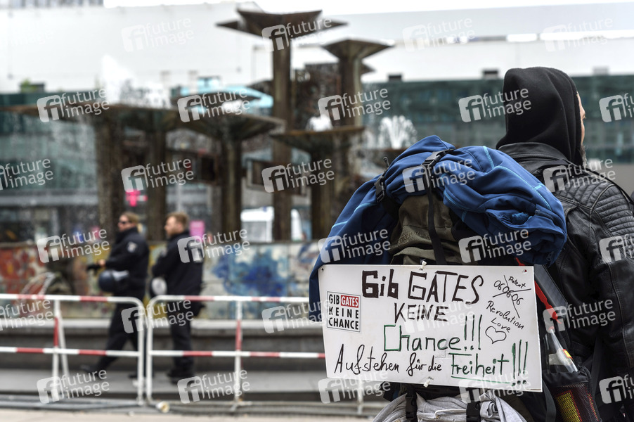 Prostest gegen die Einschränkung der Grundrechte durch Corona-Eindämmungsverordnung im Rahmen Infektionsschutzes auf dem Berliner Alexanderplatz. An dem Protest beteiligten sich Verschwörungstheoretiker, Impfgegner aber auch rechte Gruppierungen und Hooligans. Die Polizei nahm mehrere Personen wegen des Verstoßes gegen die Corona-Eindämmungsmßnahmen fest. Derzeit sind in Berlin nur ortsfeste Proteste mit 50 Teilnehmern erlaubt. Ein Teil der Protestaktoien war nicht angemeldet. Berlin, 16.05.2020