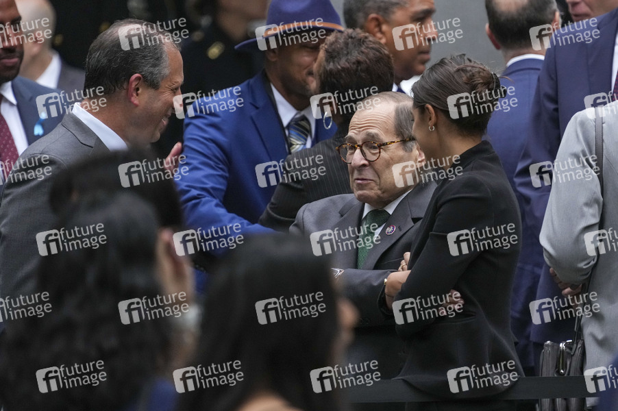 Jerry Nadler und Alexandria Ocasio-Cortez bei der Gedenkfeier für die Opfer der Terroranschläge vor 21 Jahren am 9/11 Memorial. Mit Schweigeminuten und der Verlesung der Namen der fast 3000 Todesopfer haben die USA am Sonntag an die Terroranschläge vom 11. September 2001 erinnert. Am früheren Standort des World Trade Centers in New York verlasen Angehörige wie jedes Jahr am 11. September die Namen aller Anschlagsopfer. New York, 11.09.2022