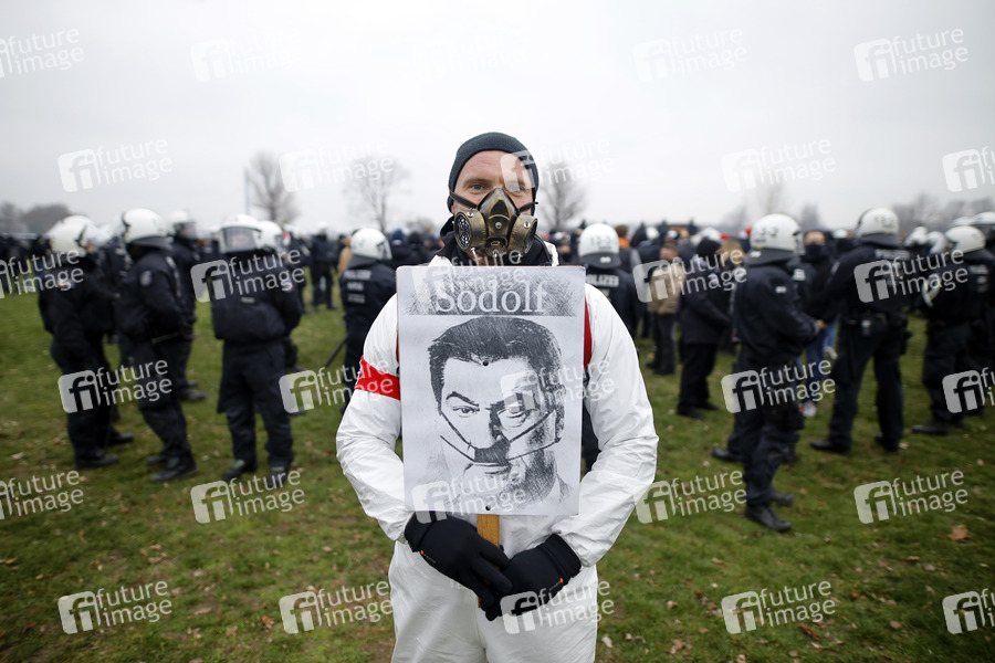 Ein Demonstrant posiert mit einem im Stile Adolf Hitler verfremdeten Konterfei von Markus Söder, betitelt als 'Södolf', auf der Querdenken-Demo im Rheinpark Golzheim. Düsseldorf, 06.12.2020