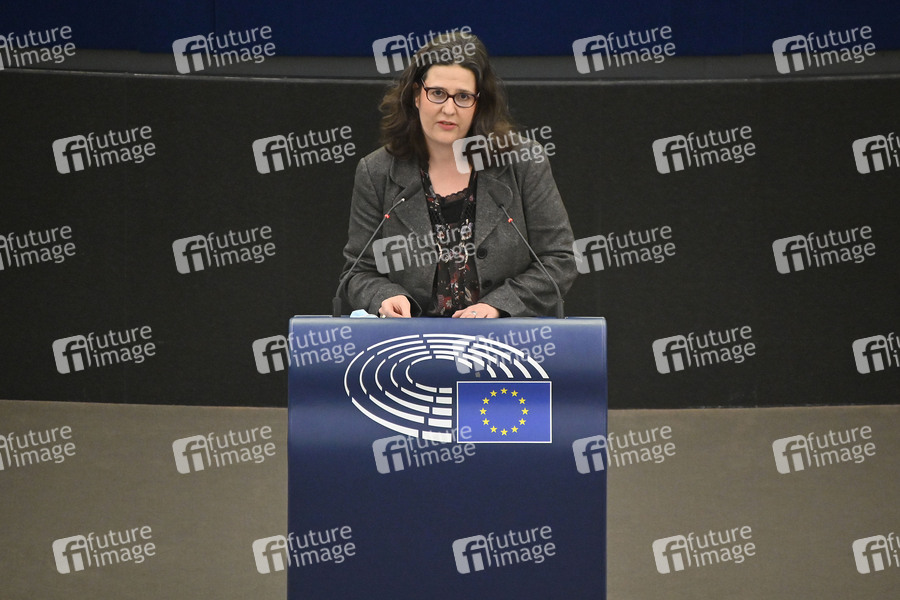 Gwendoline Delbos-Corfield bei einer Plenartagung zur Zusammenarbeit und Gemeinsamkeiten des Putin-Regimes und rechtsextremer sowie separatistischer Bewegungen in Europa im Plenarsaal des Europäischen Parlaments. Straßburg, 06.04.2022