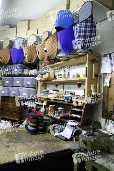 Die Werkstatt von Reno Jünemann. Schuhmacher Reno Jünemann führt in 4. Generation das Unternehmen Jünemann's Pantoffeleck in Berlin Mitte. Seit 113 Jahren befindet es sich im Familienbesitz. Berlin, 22.04.2021