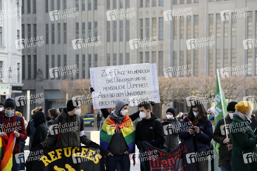 Überparteiliche Kundgebung der Grünen Jugend, Linksjugend solid und JUSO unter dem Motto 'Görlitz zeigt Haltung!' gegen Verschwörungstheorien und demokratiefeindliches Gedankengut auf dem Marienplatz. Görlitz, 27.02.2022