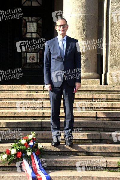 Michael Müller beim Gedenkmoment zum 12 Uhr-Glockenschlag der Freiheitsglocke im Turm des Schöneberger Rathauses mit Gebindeniederlegung aus Anlass des 70-jährigen Jubiläums des ersten Glockenschlags vor dem Rathaus Schöneberg. Berlin, 24.10.2020