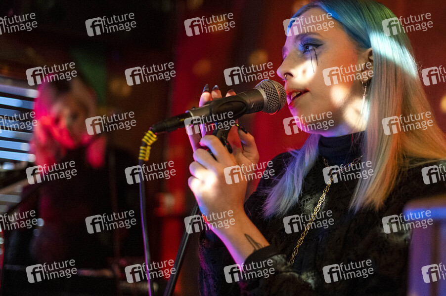 Solveig Matthildur Kristjansdottir und Laufey Soffia von Kaelan Mikla bei einem Online-Konzert aus dem geschlossenen Prikid Kaffihús. Da Bars ohne Speisezubereitung wegen der Corona-Pandemie geschlossen sein müssen, veranstaltet das Prikid Kaffihús regelmäßig Online-Konzerte mit bekannten isländischen Künstlern. Reykjavik, 20.12.2020