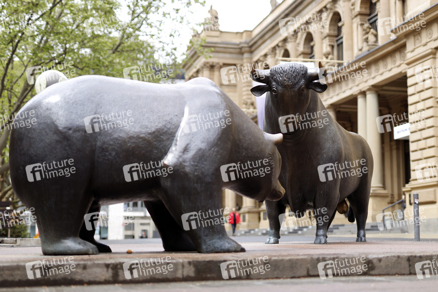 Bulle und Bär vor der Frankfurter Wertpapierbörse. Die Deutsche Börse hat im dritten Quartal unter anderem von den Turbulenzen am Strommarkt profitiert. Zudem zahlten sich zuletzt getätigte Übernahmen weiter aus. (Themenbild, Symbolbild) Frankfurt, 15.10.2021