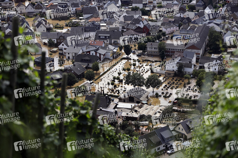 In der Eifel haben heftige Regenfälle und Dauerregen für Überschwemmungen und Überflutungen gesorgt. Im Ahrtal trat der Fluss vielerorts über die Ufer und überschwemmte nicht nur Keller sondern ganze Ortschaften. Im Bild der überspülte Friedhof in dem Ort Dernau (Landkreis Ahrweiler), der beinahe komplett von den Wassermassen geflutet wurde. Viele Menschen verloren alles. Dernau, 15.07.2021