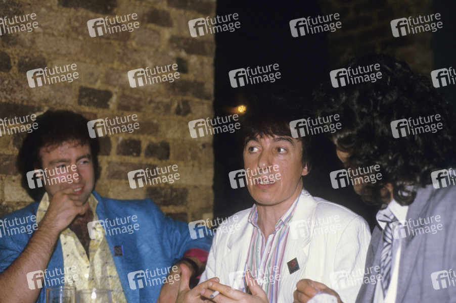 Paul Rodgers, Bill Wyman und Jimmy Page von Willie and the Poor Boys bei einem Pressetermin. London, 18.04.1985