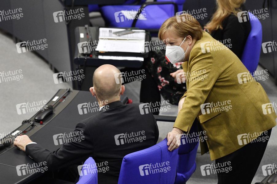 Ralph Brinkhaus und Angela Merkel in der 215. Sitzung des Deutschen Bundestages im Reichstagsgebäude. Berlin, 04.03.2021