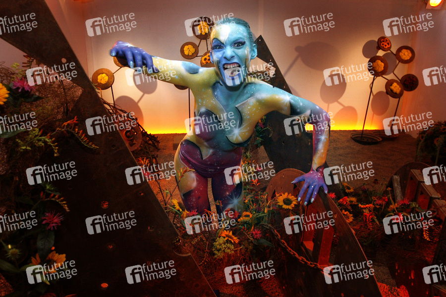 Bodypainting und Fotoshooting mit Model Sarah am Tag der offenen Tür der Meisterschule Justus-von-Liebig-Schule, Abteilung Floristik in Hannover-Ahlem. Künstler: Jörg Düsterwald