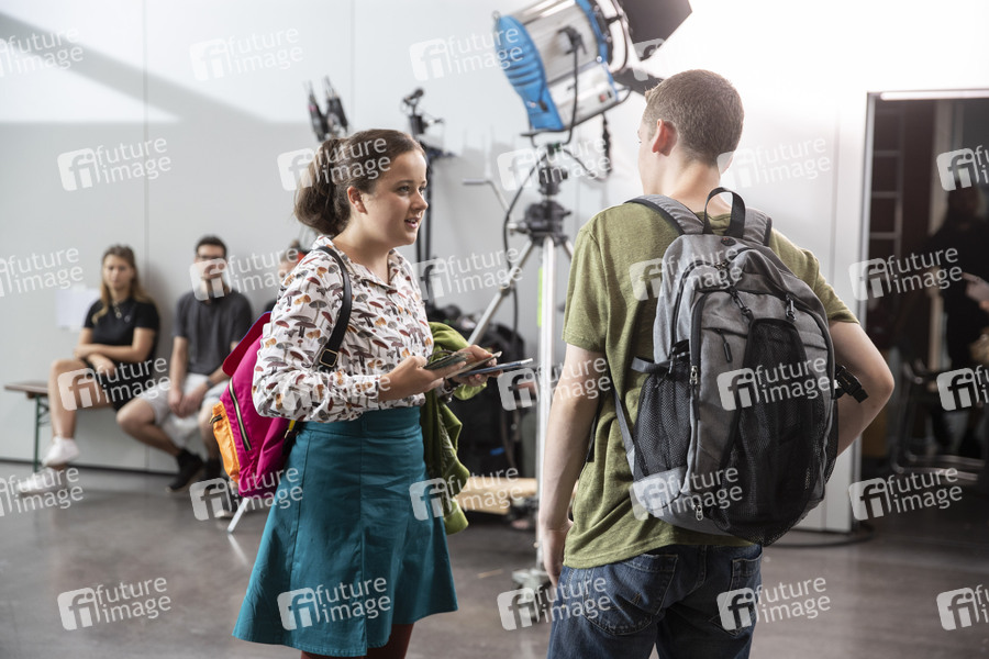 Madeleine Haas und Fridolin Sommerfeld beim Pressetermin zum KiKA-Themenschwerpunkt 'Respekt für meine Rechte! Schule leben!' am Set der KiKA-Fernsehserie 'Schloss Einstein' im Albert-Einstein-Gymnasium. Erfurt, 27.08.2019