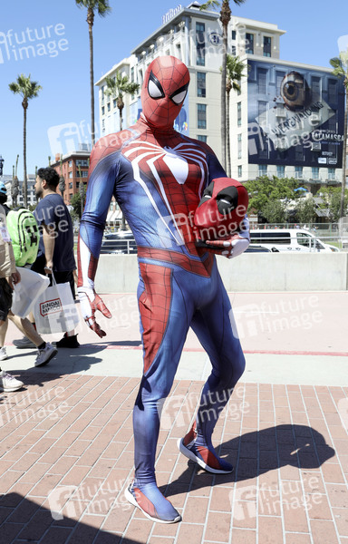Spiderman Cosplayer mit Deadpool Kopf auf der San Diego Comic-Con International 2025 vor dem Convention Center. San Diego, 27.07.2025