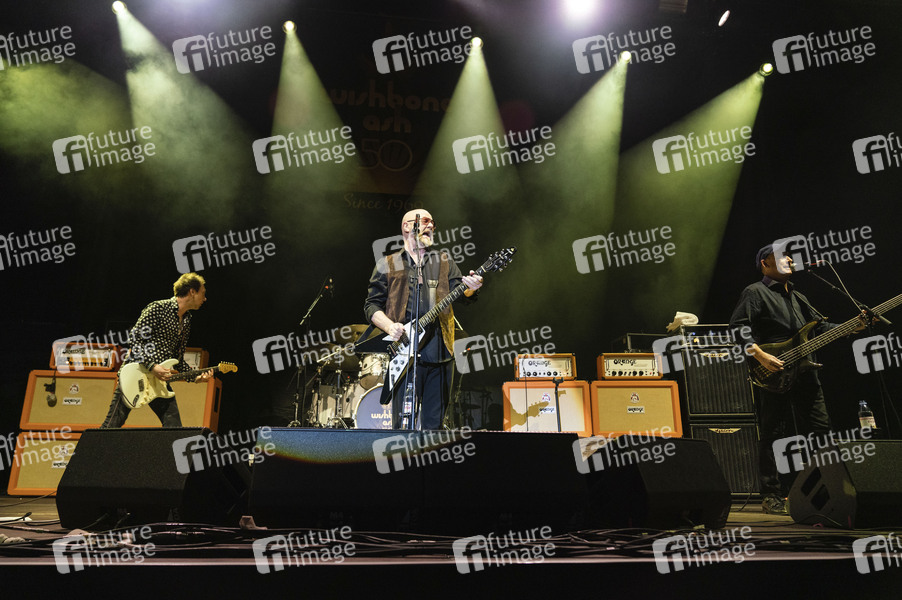 Mark Abrahams, Andy Powell und Bob Skeat von Wishbone Ash live beim Konzert 'Music & Stories 2020' in der Swiss Life Hall. Hannover, 24.01.2020