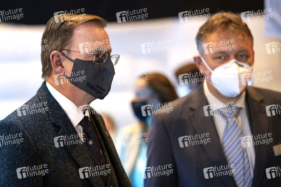 Politiker, Die Linke, Ministerpräsident von Thüringen, Ausstellung, Fair, Messe, Präsentation, Fachmesse und Konferenz für vorbeugende Corona-Schutzmaßnahmen, Corona, Sars-CoV-2, Covid-19, Coronavirus, Coronaviren, Corona-Virus, Coronakrise, Corona-Krise, Corona-Pandemie, Coronamaßnahmen, Corona-Schutz, Infektionsschutz, hybride Veranstaltung in Teil-Lockdown, Provention