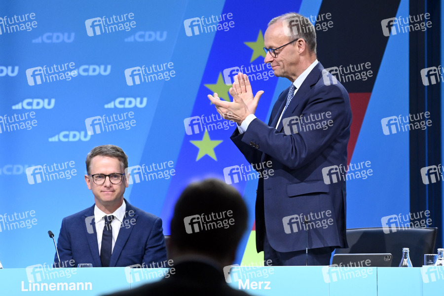 Carsten Linnemann und Friedrich Merz bei der Tagung vom Bundesausschuss der CDU Deutschlands im Estrel Berlin. Berlin, 28.04.2025