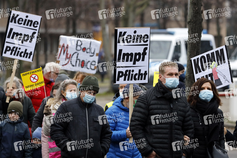 Bei einer angemeldeten Demo demonstrierten etwa 8000 Gegner einer Impfpflicht mit einem Spaziergang gegen die Corona-Maßnahmen der Bundesregierung - darunter auch viele Pflegekräfte, die wegen der Impfpflicht im Gesundheitsbereich ihren Job zu verlieren drohen. Düsseldorf, 15.01.2022