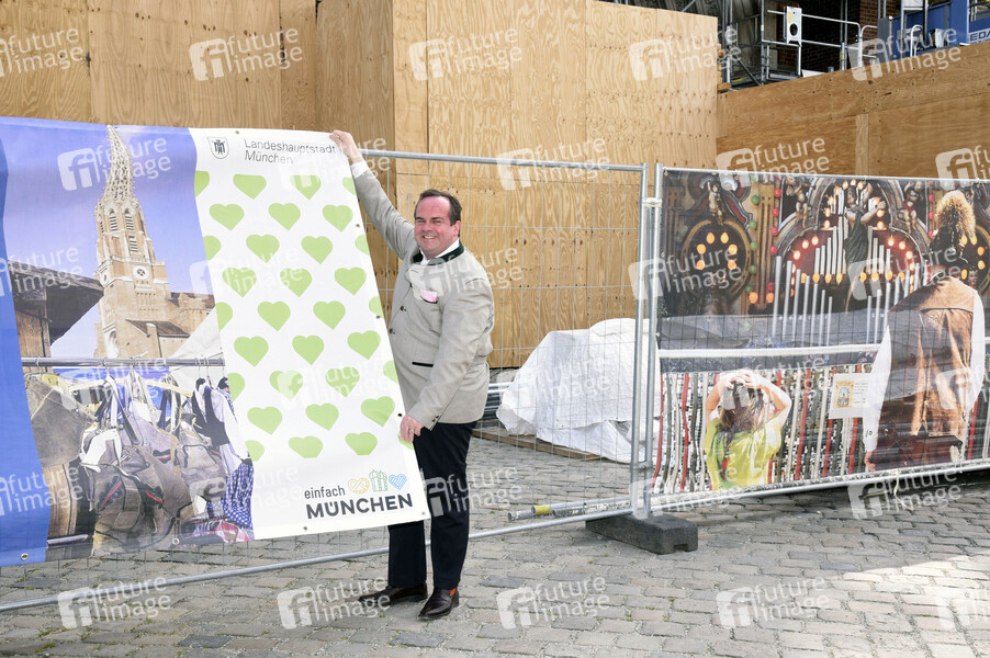 Clemens Baumgärtner (Wirtschaftsreferent und Dult-Chef) beim Aufhängen symbolischer Banner zur Absage des Maidult am Bauzaun der Mariahilfkirche und Übergabe von Gutscheinen 'Dult ist Kult!' auf dem Mariahilfplatz. München, 24.04.2020