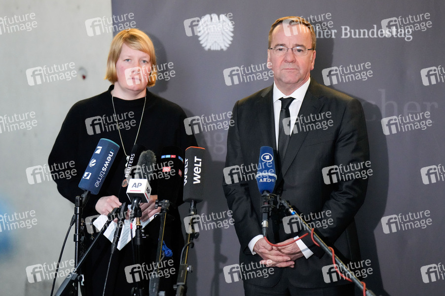 Wiebke Esdar und Boris Pistorius beim Pressestatement im Vorfeld der 5. Sitzung Gremium Sondervermögen Bundeswehr im Reichstagsgebäude. Berlin, 20.03.2024