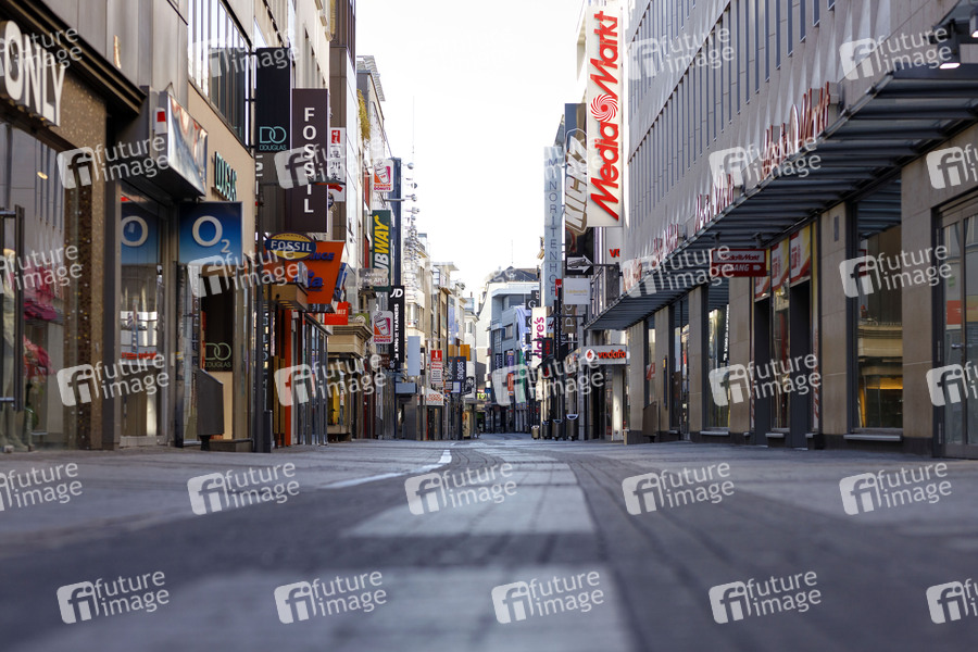 Die menschenleere Hohe Straße mit geschlossenen Läden während der Corona-Krise. Köln, 22.03.2020