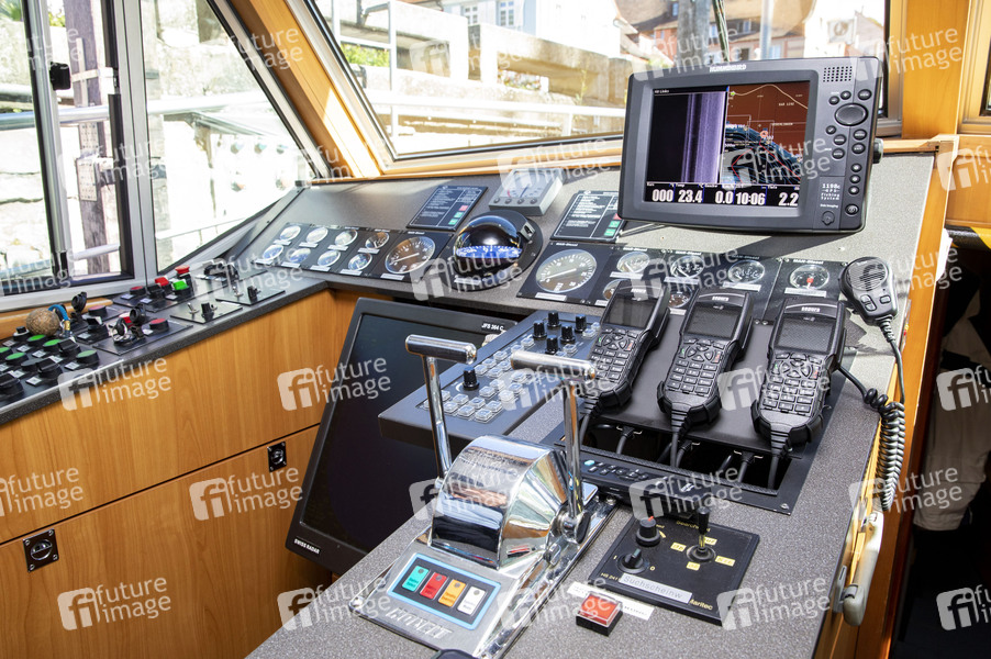 Steuerstand auf dem Wasserschutzpolizeiboot beim exklusiven Fototermin bei der Wasserschutzpolizei-Station Überlingen. Überlingen, 19.08.2020