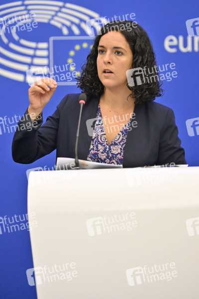 Manon Aubry beim Pressebriefing der Fraktion Die Linke im Europäischen Parlament. Straßburg, 13.09.2022