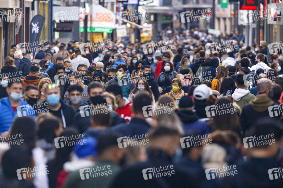 Köln ist weiter Corona-Risikogebiet: Im öffentlichen Raum besteht auf vielen Plätzen und Straßen in Köln die Pflicht zum Tragen einer Mund-Nase-Bedeckung, so etwa für sämtliche Fußgängerzonen und Einkaufsstraßen, in der Altstadt, auf den Kölner Ringen, auf dem Rheinufer linksrheinisch zwischen Mülheimer Brücke und Südbrücke, auf dem Rheinboulevard sowie bei Versammlungen nach dem Versammlungsgesetz. - Im Bild die Hohe Straße mit Passanten. (Themenbild, Symbolbild) Köln, 02.11.2020