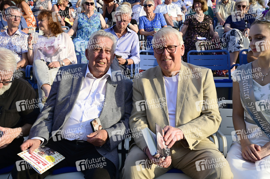 Egon Krenz und Bernhard Knuth bei der Premiere des Theaterstücks 'Maxe Baumann - Ferien ohne Ende' während der Beelitzer Festspiele 2025 auf der Freilichtbühne. Beelitz, 14.08.2025