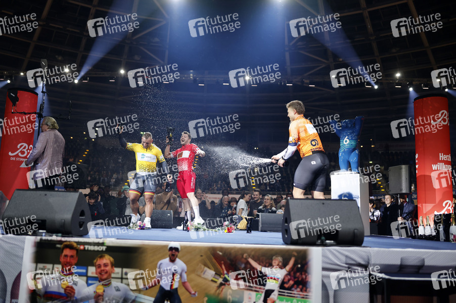 Mateusz Rudyk (POL), Maximilian Dörnbach (GER) und Robert Förstemann (GER) mit einer Champagnerdusche beim Sixdays Weekend 2025 im Velodrom. Berlin, 01.02.2025