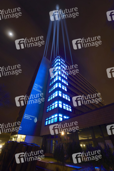Lichtinstallation zum Weltwassertag (22.03.2021) am Gebäude der Stadtentwässerung. Bildfreigabe der Lichtinstallation durch Matthias Görn, Geschäftsleiter der Stadtentwässerung Hannover) und Felix Reinhold (allstars event Veranstaltungstechnik). Hannover, 21.03.2021