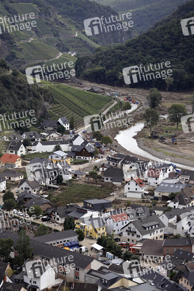 Nach dem Jahrhunderthochwasser in der Eifel durch heftige Regenfälle und Dauerregen mit Überschwemmungen und Überflutungen haben die Aufräumarbeiten im Ahrtal große Fortschritte gemacht. Einheiten von Polizei, THW, Bundeswehr und Feuerwehr mitsamt vielen freiwilligen Helfern haben Straßen geräumt, Schutt und Schlamm entfernt und die Menschen versorgt. Der Wiederaufbau wird trotzdem Jahre dauern. Im Bild Flutschäden in der Ortschaft Dernau, in der die Flut viele Häuser zerstörte, 08.08.2021