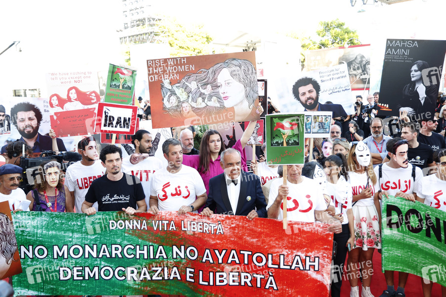 Damien Chazelle und Alberto Barbera nehmen Flashmob aus Solidarität mit dem iranischen Volk nach der Verurteilung von Saeed Roustaee teil, vor der Premiere des Kinofilms 'Maestro' auf der Biennale di Venezia 2023 / 80. Internationale Filmfestspiele von Venedig im Palazzo del Cinema. Venedig, 02.09.2023
