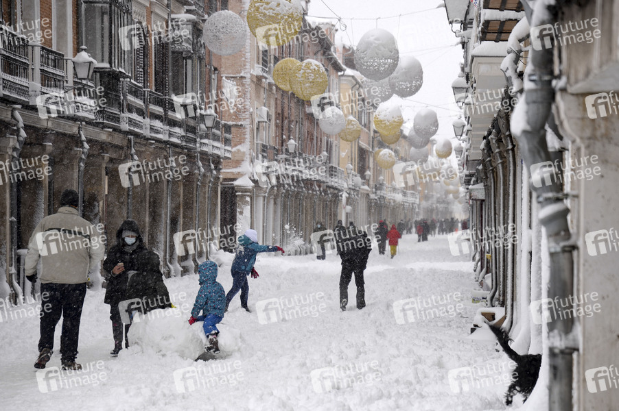 Das Sturmtief Filomena sorgt in der Region Madrid und anderen Teilen Spaniens mit starken Schneefällen für Chaos. Die Hauptstadt Madrid wurde durch historisch heftigen Schneefall lahmgelegt. Seit 50 Jahren hat es nicht so geschneit. Der Verkehr ist in weiten Teilen des Landes zusammengebrochen. Alcalá de Henares, 09.01.2021