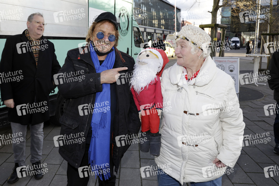 Frank Zander bei der Spendenscheckübergabe an den Caritas-Foodtruck und der Verteilung von Essen und Geschenken aus dem Food Truck an Obdachlose und Bedürftige am Alexanderplatz. Berlin, 02.12.2021