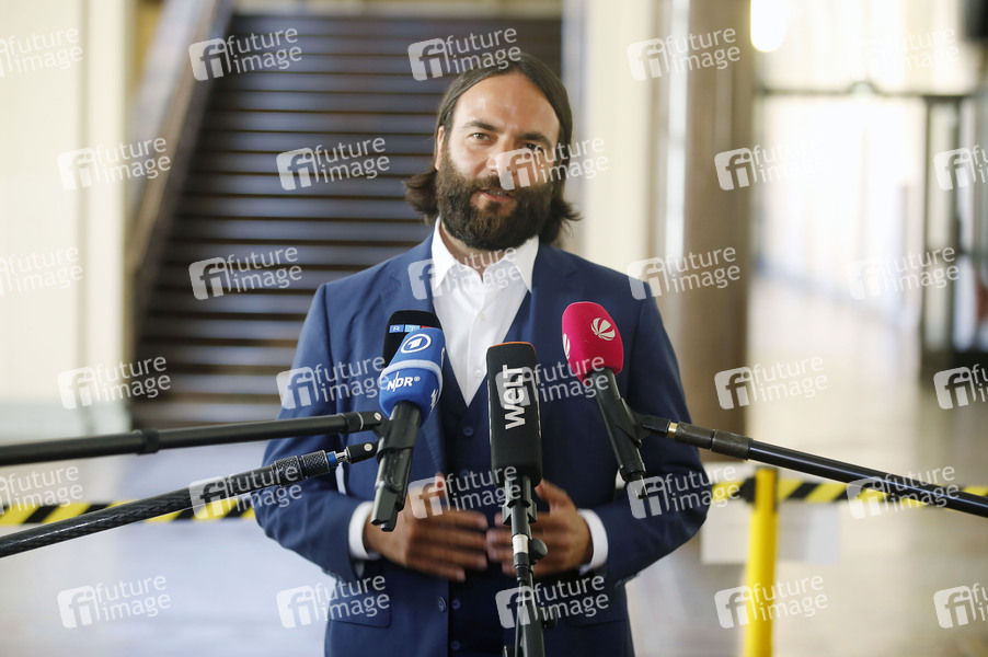 Verteidiger Ingo Bott beim Pressestatement zum Prozess wegen mutmaßlicher Kindesentführung gegen Christina Block am Landgericht Hamburg. Hamburg, 19.08.2025