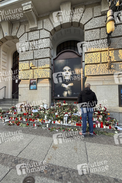 Blumen, Kerzen und Fotos sind an einem Gedenkort für die verstorbene Rosenstolz-Sängerin AnNa R. am Theater des Westens zu sehen. Die Sängerin wurde 55 Jahre alt. Berlin, 22.03.2025