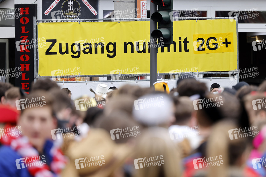 Karneval, Brauchtumszone, Brauchtum, Corona, Corona-Maßnahmen, 3G, 2G, 2G+, 3G+, 2G-Regel, 2G+-Regel, Delta-Variante, Omikron, Infektion, Infektionsgeschehen, Mindestabstand, Maskenpflicht, geimpft, genesen, getestet, Geimpfte, Genesene, Getestete, Covid, Covid19, Covid-19, Sars-Cov2, Virus, Viren, Infektionsschutzgesetz, Weiberfastnacht, Karnevalssaison, Corona-Lage, Inzidenz, Alaaf, Gastronomie, Sicherheit, Corona-Zahlen, Hotspot, Hotspots, Kontrolle, Besucher, Inzidenzzahlen, Superspreader-Event, Touristen, Ungeimpfte, ungeimpft, Corona-Impfung, Impfung, Infektionsrisiko, Festkomitee Kölner Karneval, 2G-Karneval, Dreigestirn, Narren, Tradition, Kultur, Brauchtum, Feiern, Schutz, Vorbeugung, Prävention, Corona-Karneval, Karnevalsfiguren, Tradition, Karnevalsgesellschaft, Brauchtum, Karnevalsgesellschaften, Rosenmontag, Zülpicher Straße, Quartier Latäng, Menschenmassen, Menschenmasse, Menschenmenge, überfüllt, Gedränge, dicht an dicht, Kontaktbeschränkungen, zwischenmenschliche Kontakte, Social Distancing, Schild, Zugang, nur mit 2G+
