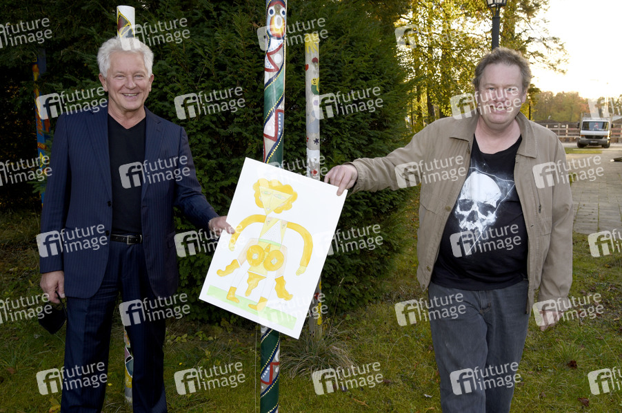 SeelenART Künstler Markus Blüml bei der Übergabe eines Aquarell-Bildes an Miroslav Nemec vor dessen Lesung aus seinem zweiten Roman 'Kroatisches Roulette' zugunsten der Tagesstätte SeelenART im Kleinen Theater. Haar, 22.10.2020