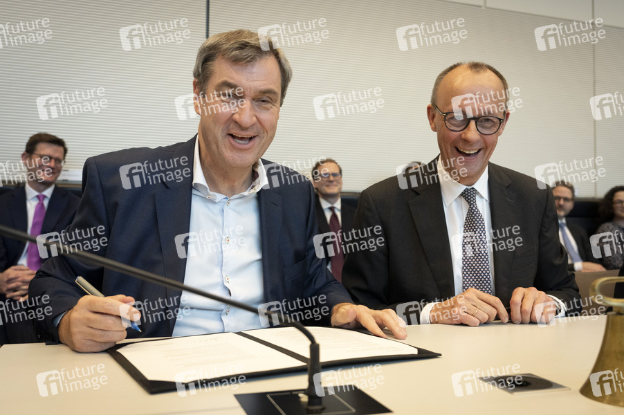 Markus Söder und Friedrich Merz bei der konstituierenden Fraktionssitzung mit Unterzeichnung des Vertrags über die Fortführung der Fraktionsgemeinschaft von CDU und CSU im Reichstagsgebäude. Berlin, 25.02.2025
