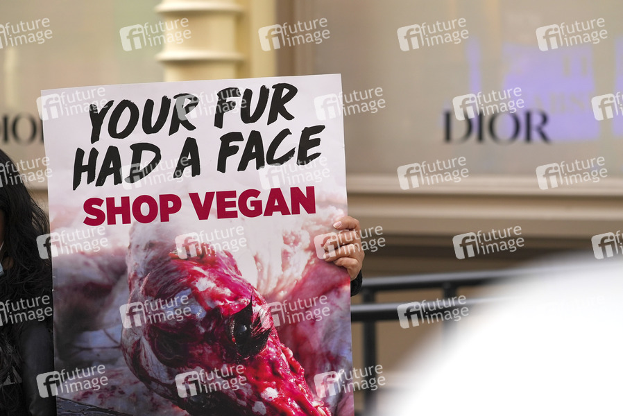 Demonstration, Demonstranten, Demo, Kundgebung, Protest, Aktion, Banner, Aktivisten, Pelz. Pelze, Leder, Pelzkleidung, Tierschutz, vegan, Echtpelz, Mode, Kunstpelz, Peta