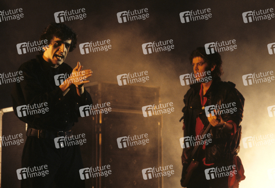 Jaz Coleman und Paul Raven von Killing Joke bei den Dreharbeiten zum Musivideo 'Kings and Queens' im Wembley-Stadion. London, 05.03.1985