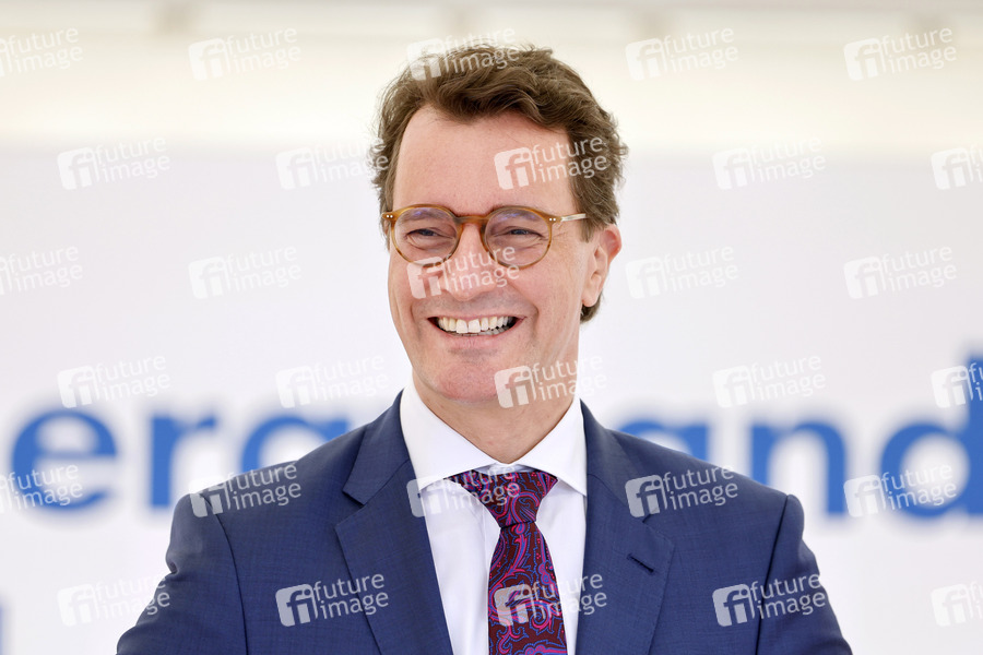 Politiker, CDU, Union, Ministerpräsident des Landes Nordrhein-Westfalen, NRW-Ministerpräsident, Auftritt, Shell, Industrie, Raffinerie, Royal Dutch Shell, Produktionsanlage, Gaskonzern, Gasindustrie, Ölindustrie, Ölkonzern, Treibstoff, Klimaziele, Förderung, Energiewende, Chemieindustrie, Kohlendioxid-Ausstoß, Gas, Erneuerbare Energien, Umweltschutz, Energietechnik, Umweltpolitik, Gaspreis, Gaspreise, Industriepolitik, Energiepolitik, Shell Energy, Chemicals Park Rheinland, CO2-neutral, Nachhaltigkeit, CO2-Neutralität, Biogas, Bio-Gas, Bio-LNG, flüssiges Gas, Biomethan, Methangas, Methan-Gas, Baustelle, lachend, Lachen