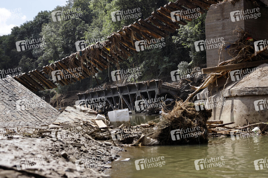 Nach dem Jahrhunderthochwasser in der Eifel durch heftige Regenfälle und Dauerregen mit Überschwemmungen und Überflutungen haben die Aufräumarbeiten im Ahrtal große Fortschritte gemacht. Einheiten von Polizei, THW, Bundeswehr und Feuerwehr mitsamt vielen freiwilligen Helfern haben Straßen geräumt, Schutt und Schlamm entfernt und die Menschen versorgt. Der Wiederaufbau wird trotzdem Jahre dauern. Im Bild Flutschäden an einer Eisenbahnbrücke nahe der Ortschaft Rech, in der die Flut viele Häuser zerstörte, 30.07.2021