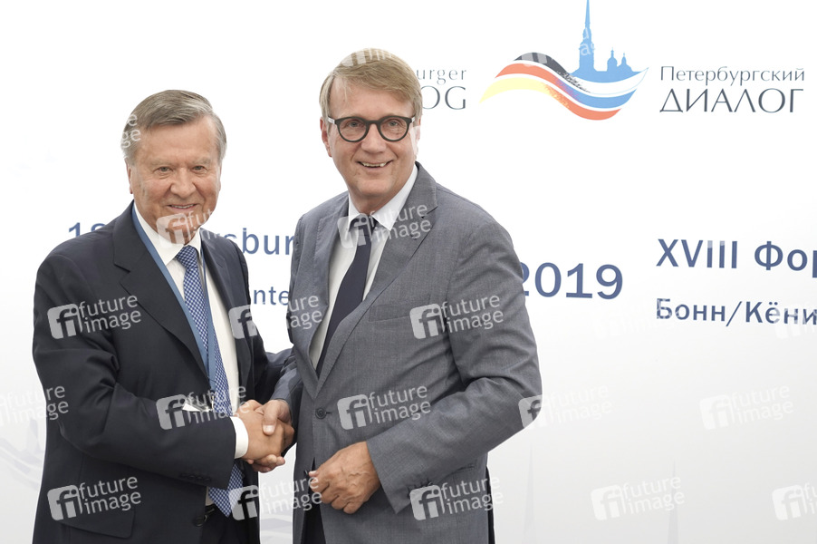 Wiktor Subkow / Viktor Zubkov und Ronald Pofalla bei der Pressekonferenz zum Auftakt des 18. Petersburger Dialogs 2019 im Steigenbeger Hotel. Königswinter, 18.07.2019