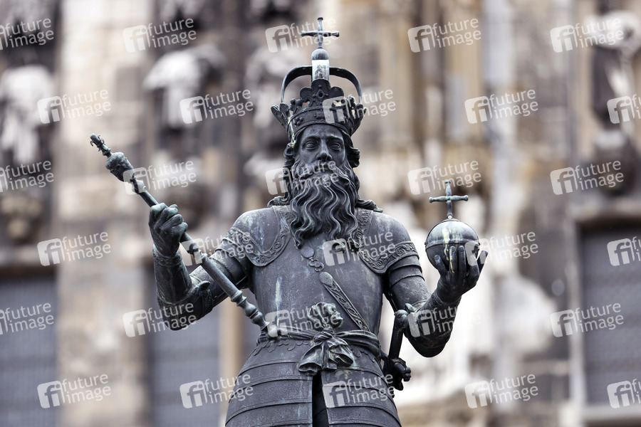 Karl der Große, Karol, Karolinger, Mittelalter, Frühmittelalter, Geschichte, Deutsche Geschichte, Historie, Kaiser, König, Statue, Aachen, Brunnen, Karlsbrunnen, Carolus Magnus, Karolus Magnus, Charlemagne, Fränkisches Reich, Kaiserwürde, Franken, Frankenreich, Herrscher, Feldzüge, Macht, Reich, Europäische Geschichte, Herrschaft, Regent, römisch-deutscher Kaiser, französischer König, Karl I., Karl der Erste, Symbolbild, Symbolfoto