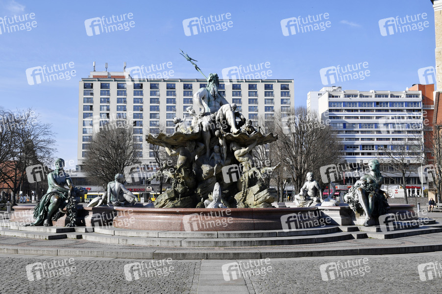 Der Neptunbrunnen. Nach zuletzt beschlossenen Schutzmaßnahmen gegen die Ausbreitung des Corona-Virus kommt das öffentliche Leben in Berlin nahezu zum Erliegen. Betroffen sind fast alle Sehenswürdigkeiten, Museen, Plätze, Strassen, Restaurants, Biergärten, Universitäten u.v.m. Berlin, 17.03.2020
